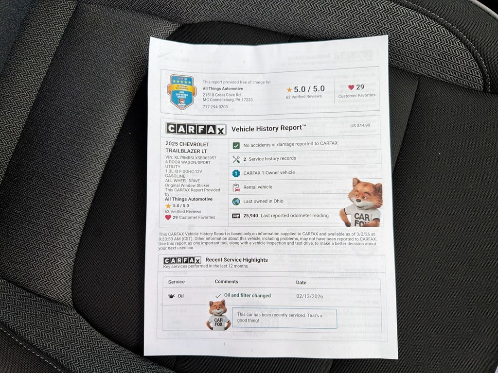 Find exceptional value in this 2025 Chevrolet TrailBlazer LT, located in Bedford, PA. With only 25,938 miles, this Chevrolet TrailBlazer delivers low mileage and reliable performance from its efficient 3-cylinder, 1.3L gasoline engine paired with all-wheel drive for confident handling in varied road and weather conditions. Clean CARFAX Report assures a transparent history, giving you added peace of mind when choosing this late-model SUV. This Chevrolet TrailBlazer LT blends modern safety and convenience features including Lane Departure Warning, Lane Keep Assist, Remote Start, and a Back-Up Camera â" all designed to enhance daily driving comfort and confidence. The comfortable interior, thoughtful layout, and capable AWD system make it a sensible choice for commuters, small families, and active lifestyles. Priced aggressively, this Chevrolet TrailBlazer represents the best price in the market for comparable models â" combining low-mileage value with an impressive features package. Whether navigating snowy Pennsylvania winters or city streets, the Chevrolet TrailBlazer's efficient 1.3L engine helps balance performance and fuel economy while the AWD delivers extra traction when you need it. Located in Bedford, PA, this 2025 Chevrolet TrailBlazer LT is ready for a test drive. Contact us to schedule a visit, review the CARFAX details, and secure this competitively priced, low-mileage SUV before it's gone.