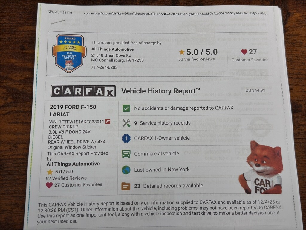 Schedule a test drive today to experience the strength of the 3.0L Diesel engine, the confidence of 4WD, and the convenience of modern tech features. Act now â" a well-equipped 2019 Ford F-150 LARIAT at this price in McConnellsburg won't last long.