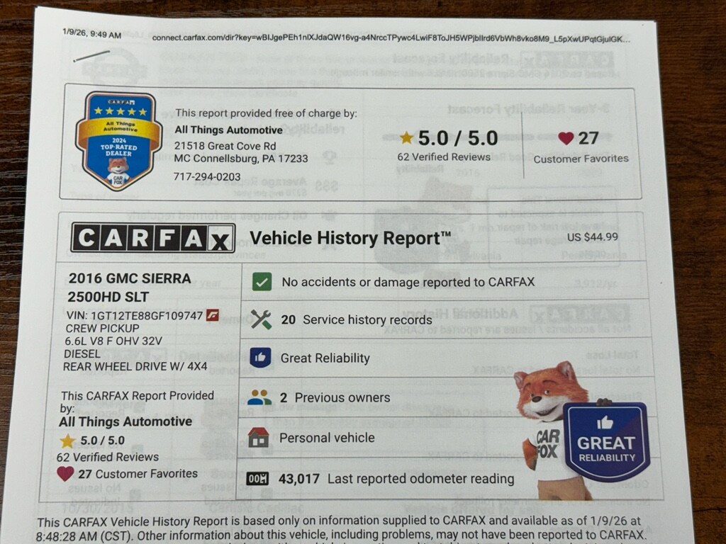 Discover this powerful 2016 GMC Sierra 2500 SLT 4WD with only 45,941 miles â" a rare find for drivers who demand capability, comfort, and value. Located in McConnellsburg, PA, this GMC Sierra comes equipped with the legendary 6.6L V8 diesel engine that delivers exceptional torque for towing and hauling while providing strong highway efficiency. Paired with four-wheel drive, it's ready for work sites, weekend adventures, and challenging road conditions.