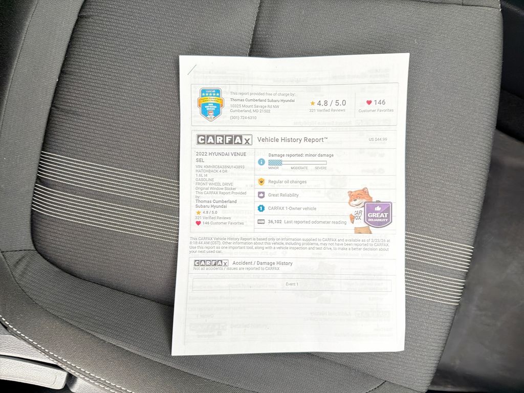 Discover exceptional value with this 2022 Hyundai Venue SEL, located in Cumberland, MD. With only 36,079 miles, this fuel-efficient 4-cylinder, 1.6L gasoline model delivers reliable FWD performance perfect for daily commuting or weekend adventures. CARFAX 1-Owner history offers peace of mind and demonstrates consistent care. The SEL trim is loaded with smart tech and safety features including Android Auto, Hands Free Bluetooth, and a Back-Up Camera for effortless connectivity and convenient parking. Advanced driver aids like Lane Keep Assist enhance safety and confidence on highway drives. Comfortable seating, well-appointed interior materials, and thoughtful storage spaces make this Hyundai Venue a practical and stylish choice for city driving. You won't find a better price nearby â€" this vehicle is competitively priced to sell quickly. Comprehensive maintenance records, clean title, and a detailed inspection ensure this Hyundai Venue is ready to go. Whether you're upgrading your daily driver or seeking a dependable second car, this 2022 Hyundai Venue SEL offers an excellent combination of features, efficiency, and value. Schedule a test drive in Cumberland, MD today to experience the smooth handling and modern conveniences firsthand. Don't miss your chance to own this top-value compact SUV at the best price in the area.