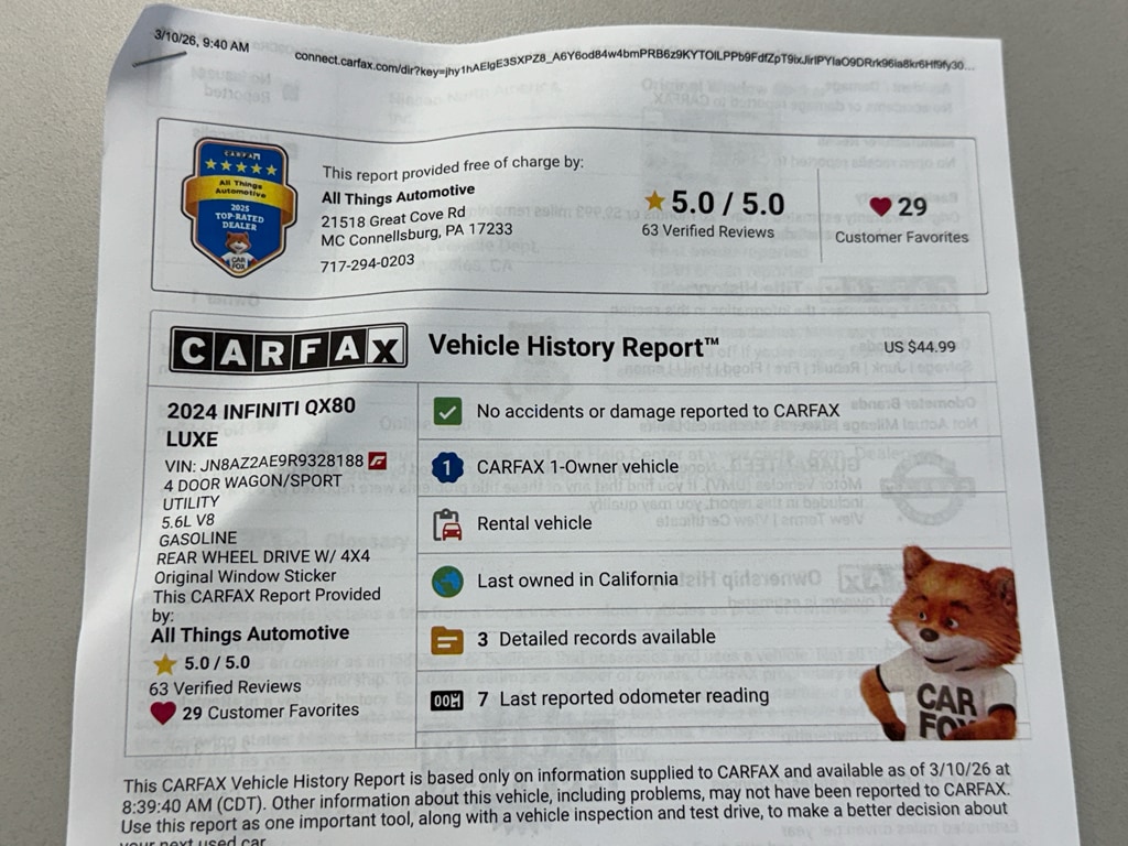 View this 2024 INFINITI QX80 SUV LUXE for sale at Thomas Subaru in Cumberland, MD.