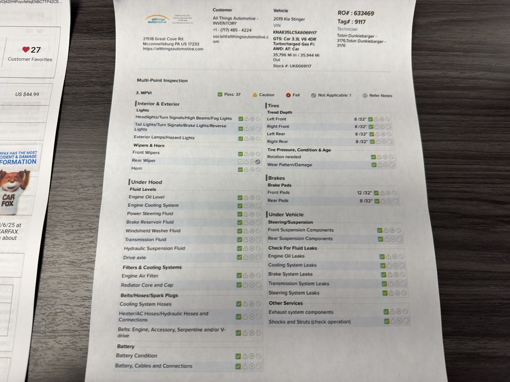 2019 Kia Stinger GTS â" 3.3L V6, AWD, 35,944 miles â" McConnellsburg, PA