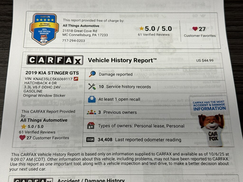 This vehicle is located in McConnellsburg, PA and is competitively priced â" offering the best price for buyers seeking performance and value in the pre-owned luxury-sport segment. Well-maintained and inspected, this Kia Stinger GTS provides a compelling combination of power, technology, and comfort. Whether you prioritize spirited performance or everyday practicality, this AWD 2019 Kia Stinger GTS is a standout choice. Contact us to schedule a test drive and secure this exceptional value today.