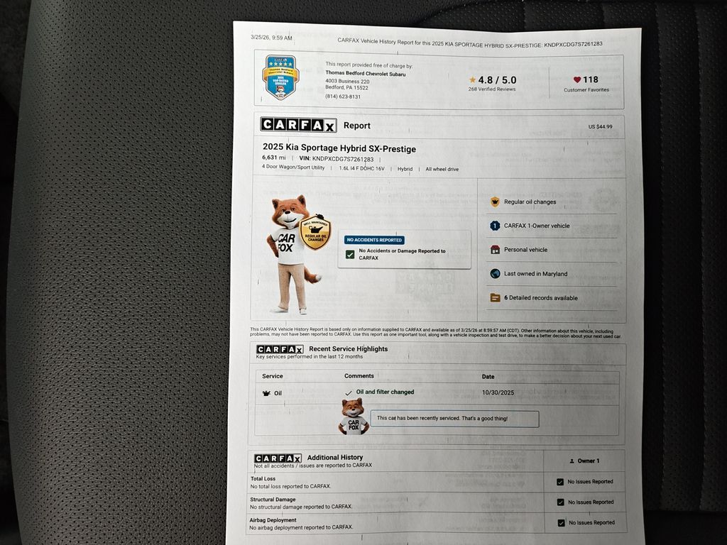 Discover exceptional value with this 2025 Kia Sportage Hybrid SX-Prestige, located in Cumberland, MD. This low-mileage example has only 6,631 miles and combines efficiency with advanced technology thanks to its 4-cylinder, 1.6L Full Hybrid Electric (FHEV) powertrain and available AWD for confident handling in varied conditions. This Sportage SX-Prestige delivers premium features including Android Auto, a Back-Up Camera, Remote Start, and an upscale interior design. The CARFAX 1-Owner history and CARFAX Clean Report provide added peace of mind, reflecting careful ownership and a clean vehicle history. With modern safety and convenience systems, this Sportage is designed for effortless daily driving and weekend adventures. We offer the best price on this Kia Sportage Hybrid, representing strong value compared to similar models in the region. Its low mileage paired with the reliable hybrid drivetrain means you'll enjoy excellent fuel economy and long-term durability. Whether you're commuting through the city or exploring rural roads around Cumberland, MD, this Kia Sportage Hybrid provides a refined ride, smart tech, and confident AWD capability. Don't miss this opportunity to own a well-maintained, feature-rich 2025 Kia Sportage Hybrid SX-Prestige at an unbeatable price. Contact us today to schedule a test drive and experience the efficiency, comfort, and advanced features firsthand.