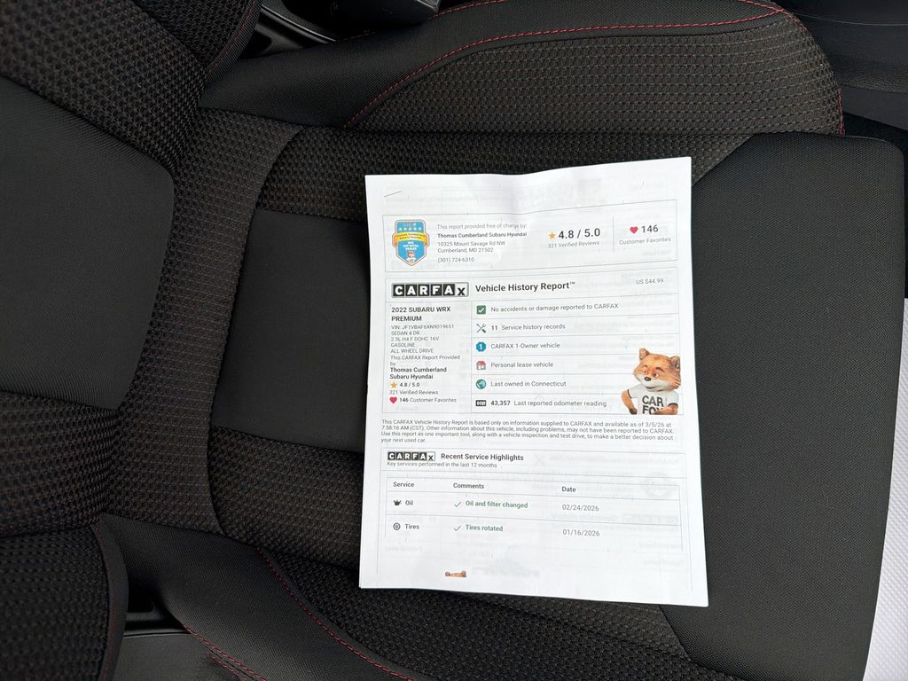 Premium 2022 Subaru WRX â" 4-Cyl 2.4L, AWD, 42,940 miles â" Cumberland, MD Looking for performance, practicality, and value? This 2022 Subaru WRX Premium delivers. Powered by a responsive 4-cylinder 2.4L gasoline engine and equipped with Subaru's legendary AWD system, this Subaru WRX offers confident handling in any weather and an engaging driving experience every day. With just 42,940 miles, this example has been gently pre-owned and maintained for miles of driving enjoyment. Features you'll love include a Back-Up Camera for safe reversing, Automatic Climate Control for comfortable cabin temperatures, XM Radio for endless entertainment, and Android Auto for seamless smartphone integration and navigation. The CARFAX 1-Owner history adds peace of mind, showing a clean ownership record and careful use. Located in Cumberland, MD, this Subaru WRX is priced to move â" we're offering the best price on this model in the area. Whether you commute, road trip, or enjoy spirited weekend drives, the Premium trim balances comfort and sportiness with supportive seats and upgraded amenities. Don't miss a chance to own a well-equipped 2022 Subaru WRX with low miles, dependable AWD capability, and modern connectivity features. Contact us to schedule a test drive in Cumberland, MD and see why this Subaru WRX is the smart choice for drivers seeking performance and value. Act now â" great deals like this go fast.
